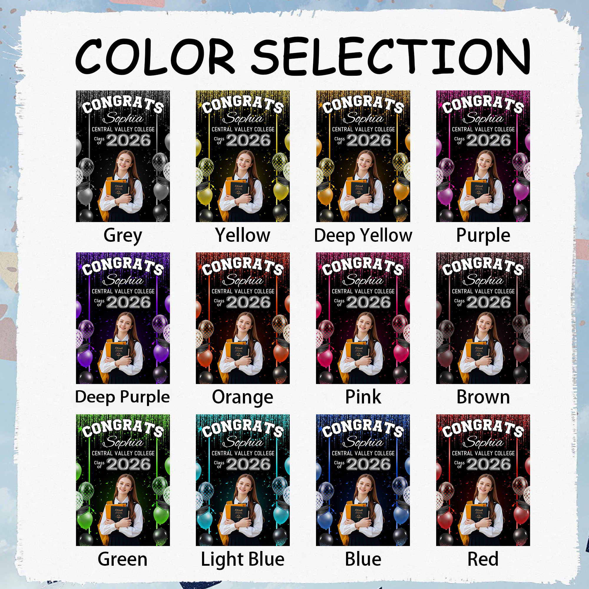 Photo & Text Integration – Your high-resolution photo is printed with true-color fidelity, positioned centrally beneath elegantly scripted “CONGRATS” and your name, school, and graduation year—ensuring clarity, emotional impact, and lasting vibrancy even under direct sunlight or seasonal rain.